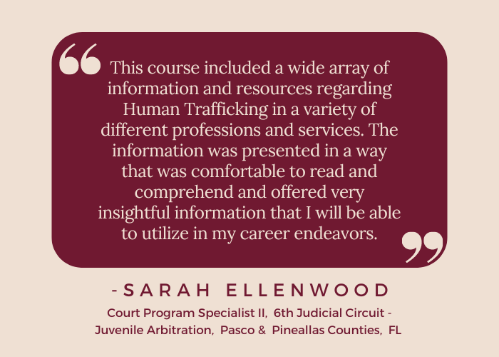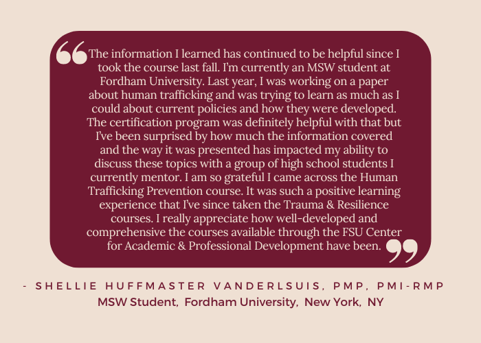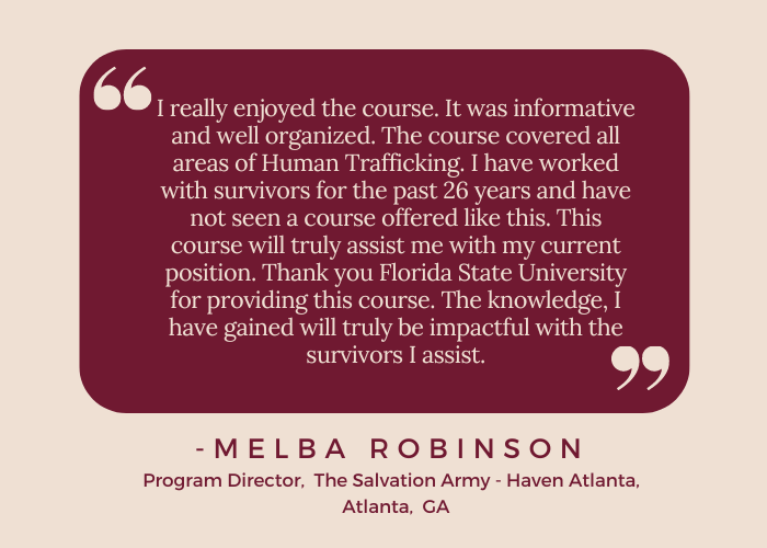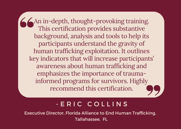 Florida State University offers an online curriculum for a Professional Certification in Human Trafficking Prevention & Intervention.