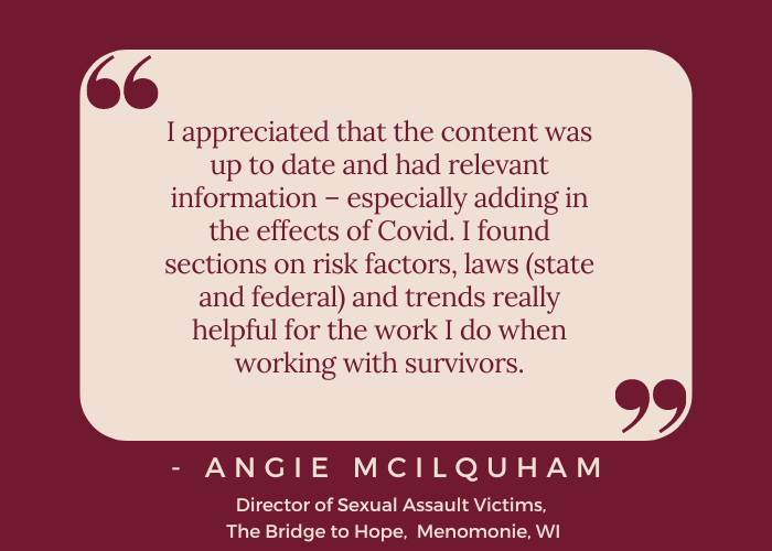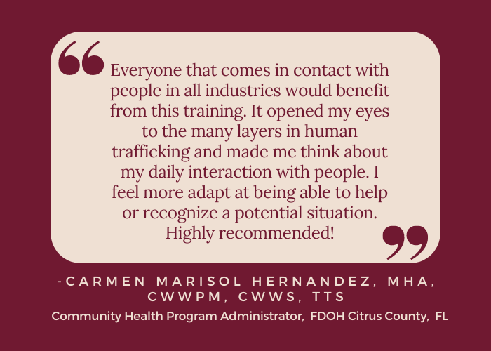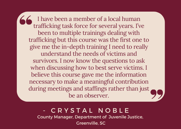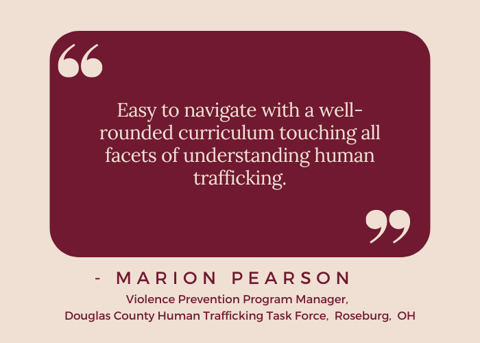 - Understand the effect of trauma on victim/survivors, preventing trafficking in vulnerable adults, and trauma-informed justice solutions.